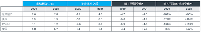 *基于疫情爆发前后实际GDP增长之间的简单差异进行计算。例如,世界经济2020年实际GDP增长估值下降4.7%,是根据疫情爆发之后的-2.1%与疫情爆发之前的2.6%之间的差异计算得出的。