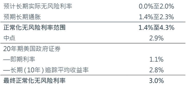 由于追逐安全资产或大规模央行货币干预,导致无风险利率异常偏低,在此时期内,估值分析师可能会考虑将无风险利率正常化。所谓“正常化”是指对无风险利率进行评估,以使该利率更可能反映美国长期政府债券的可持续平均回报率。